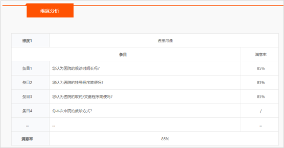 l 支持按照维度创建满意度,如:“医患沟通”、“护患沟通”、“患者需求响应”、“疼痛管理”、“用药沟通”、“出院说明”、“医院环境”、“医院整体评价”等。