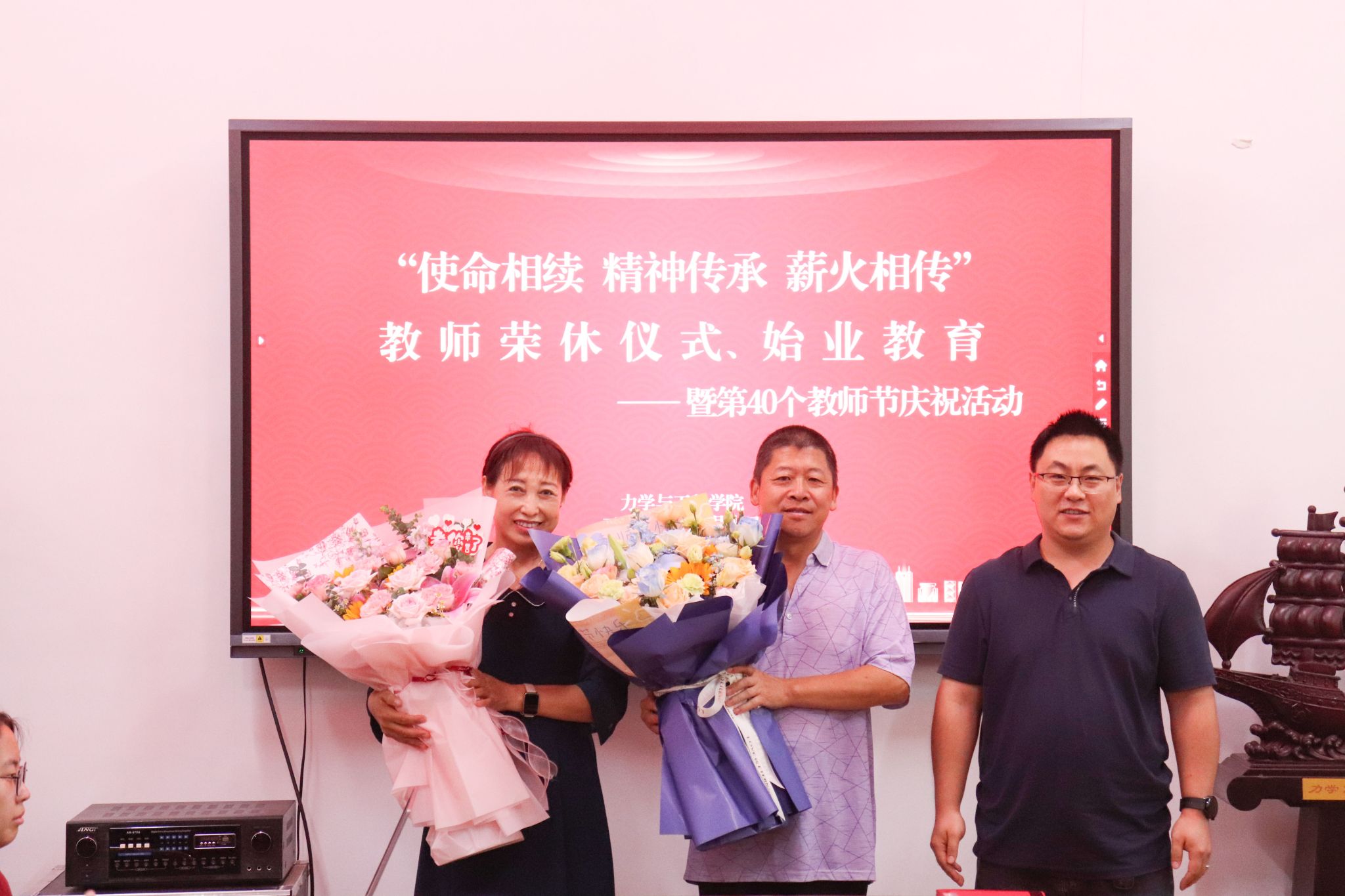 青年教师为两位老师献花。董老师深情回顾了40年的职业生涯,分享了教书育人的心得感悟,对海角视频