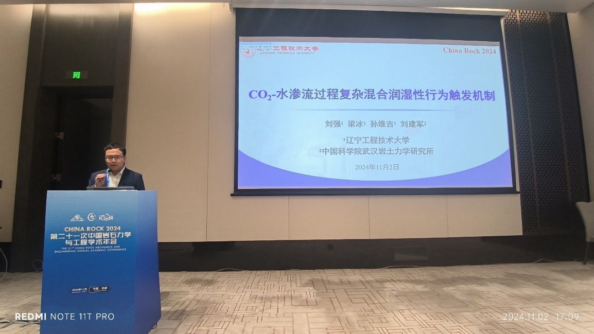 2024年11月2日,CHINA ROCK 2024第21次中国岩石力学与工程学术年会隆重召开。本次年会主题为“重大工程与风险防控”,由中国岩石力学与工程学会和国际地质灾害与减灾协会共同主办。China Rock 2024年会在成都设置主会场,全国各地设置15个中心城市会场,全国高校设置了277个卫星会场。37位两院院士和20位外籍院士,12万余名国内外科技工作者参会交流。我院刘强参加会议并作题为《CO2-水渗流过程复杂混合润湿性行为触发机制》的报告。