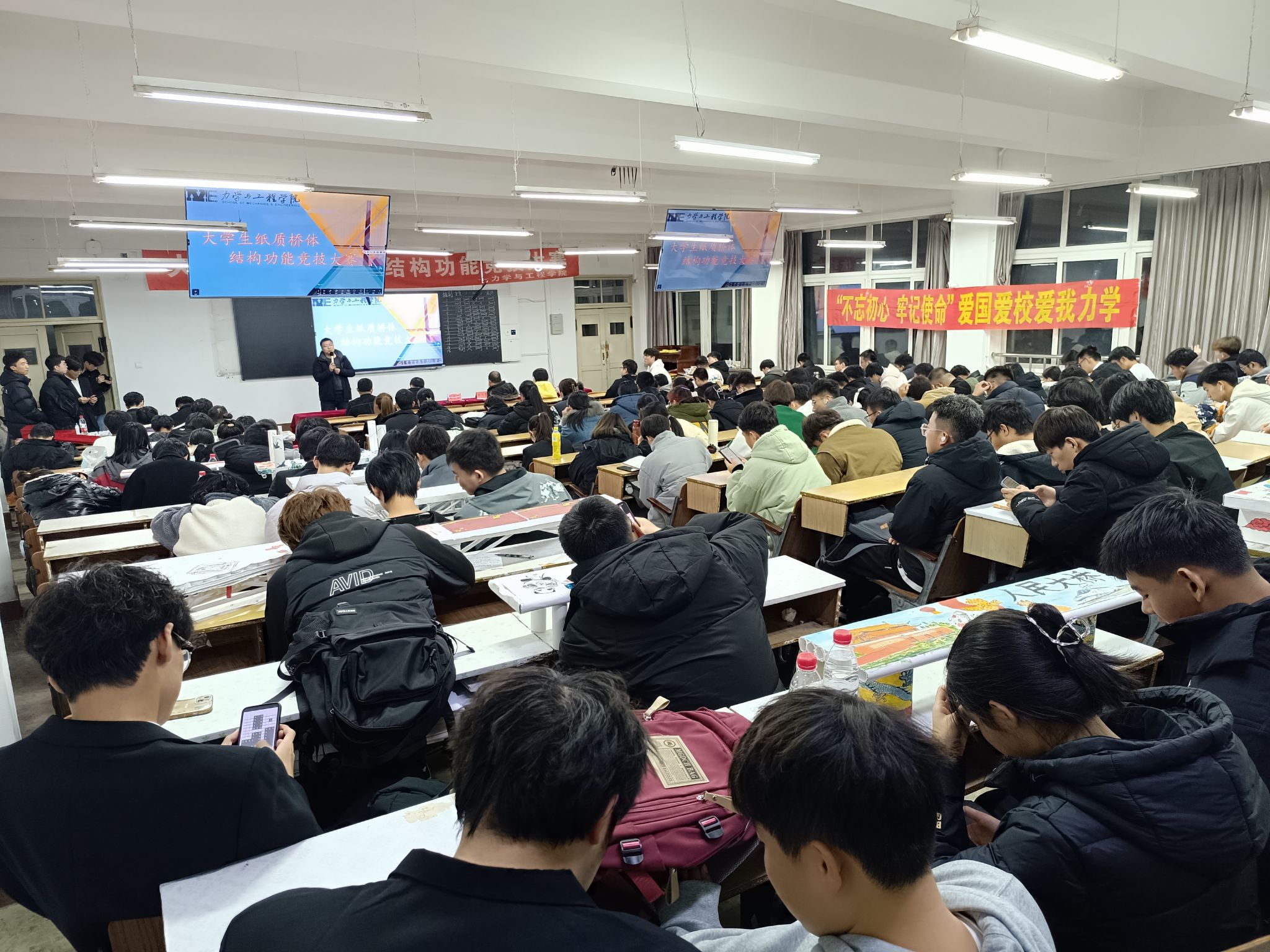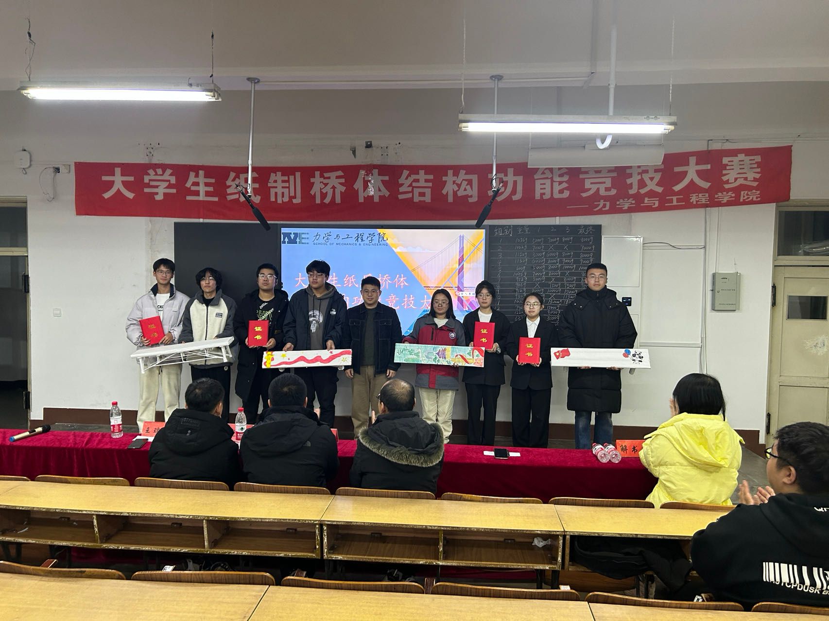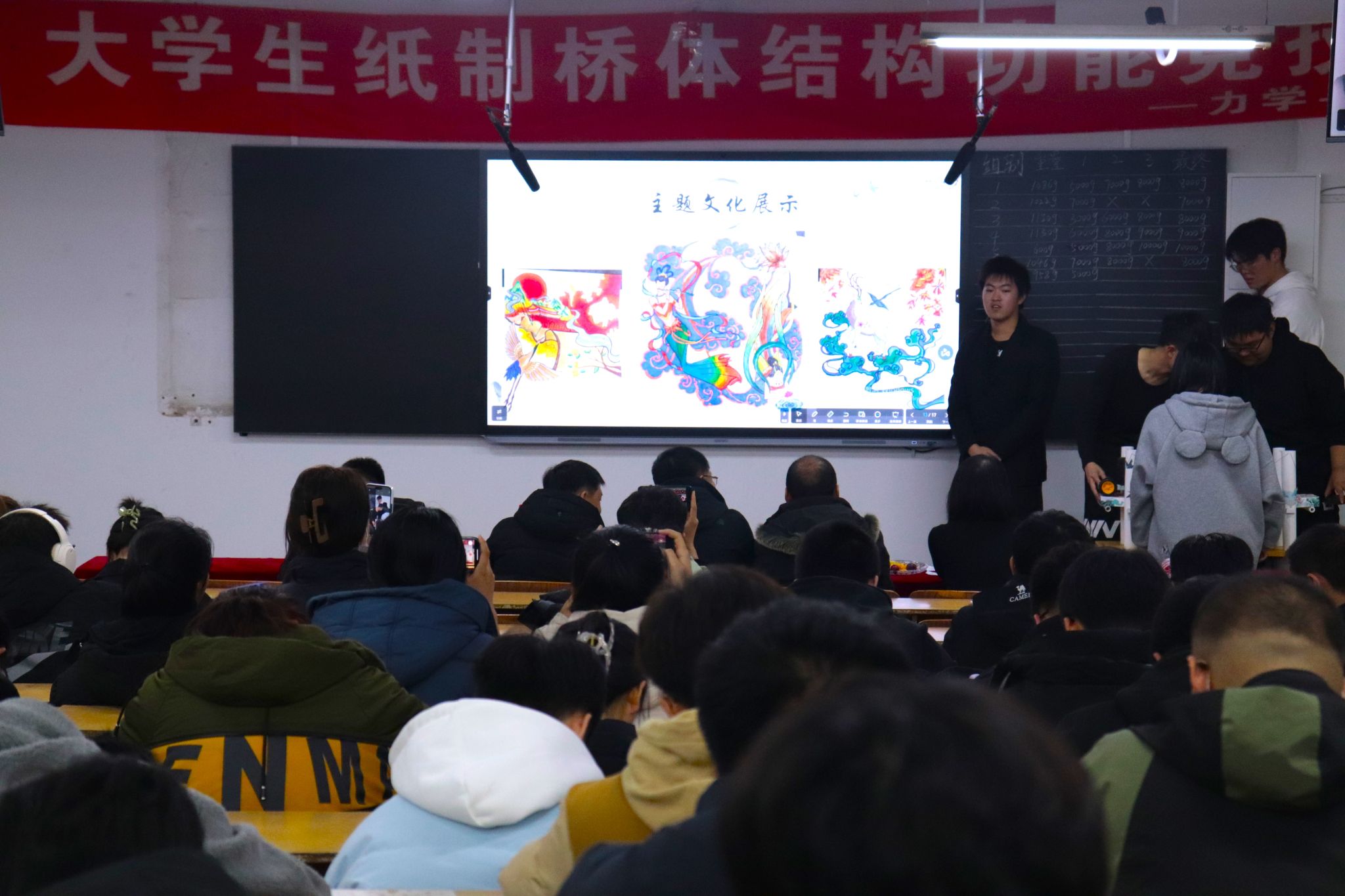 (通讯员:解书华)11月20日晚,海角视频 大学生纸质桥体结构功能竞技大赛决赛在新华楼202教室顺利举行,海角视频 副院长孙维吉老师、理论与应用力学系张智慧、工程力学系赵国超老师、团委书记解书华老师、学生工作部主任王瑞斌老师,以及2022级、2023级学生代表参会。十五组决赛队伍从初赛脱颖而出,他们带着必胜的信念和更充足的准备迎战决赛,他们蓬勃的朝气和过硬的纸桥搭建本领赢得了现场观众的掌声,得到了观众和评委的好评。本次大赛充分展现了力学学子的良好风貌,激发了大学生对力学与工程结构的兴趣。