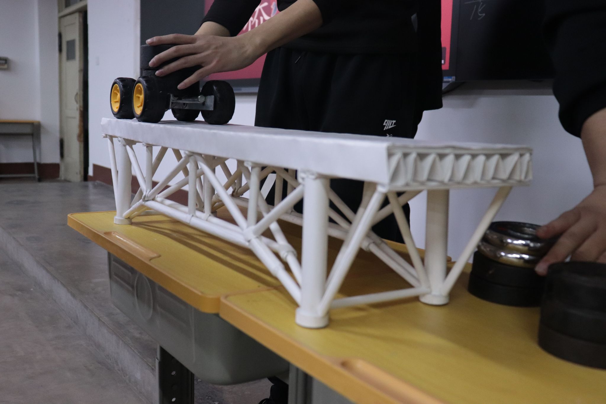 决赛当晚,座无虚席。比赛在主持人的精彩致辞和观众与评委的掌声中拉开序幕。在比赛的主体环节,十五组参赛队伍依次进行了PPT讲解,展示了他们精心设计的纸质桥梁。这些作品在结构、功能和创新性方面都体现了队员们的技艺和见解。每组队员都在有限的时间内,充分展示了自己的桥体设计理念和实践成果。随后的桥梁承重测试环节是对参赛作品实际性能的检验,也是对队员们设计理念的考验。在现场观众的紧张期待中,各组桥体在承重测试中表现出了迥异的特点。有的桥体在承受重量的过程中稳如磐石,有的桥体则在关键时刻展现出较好的承重能力。