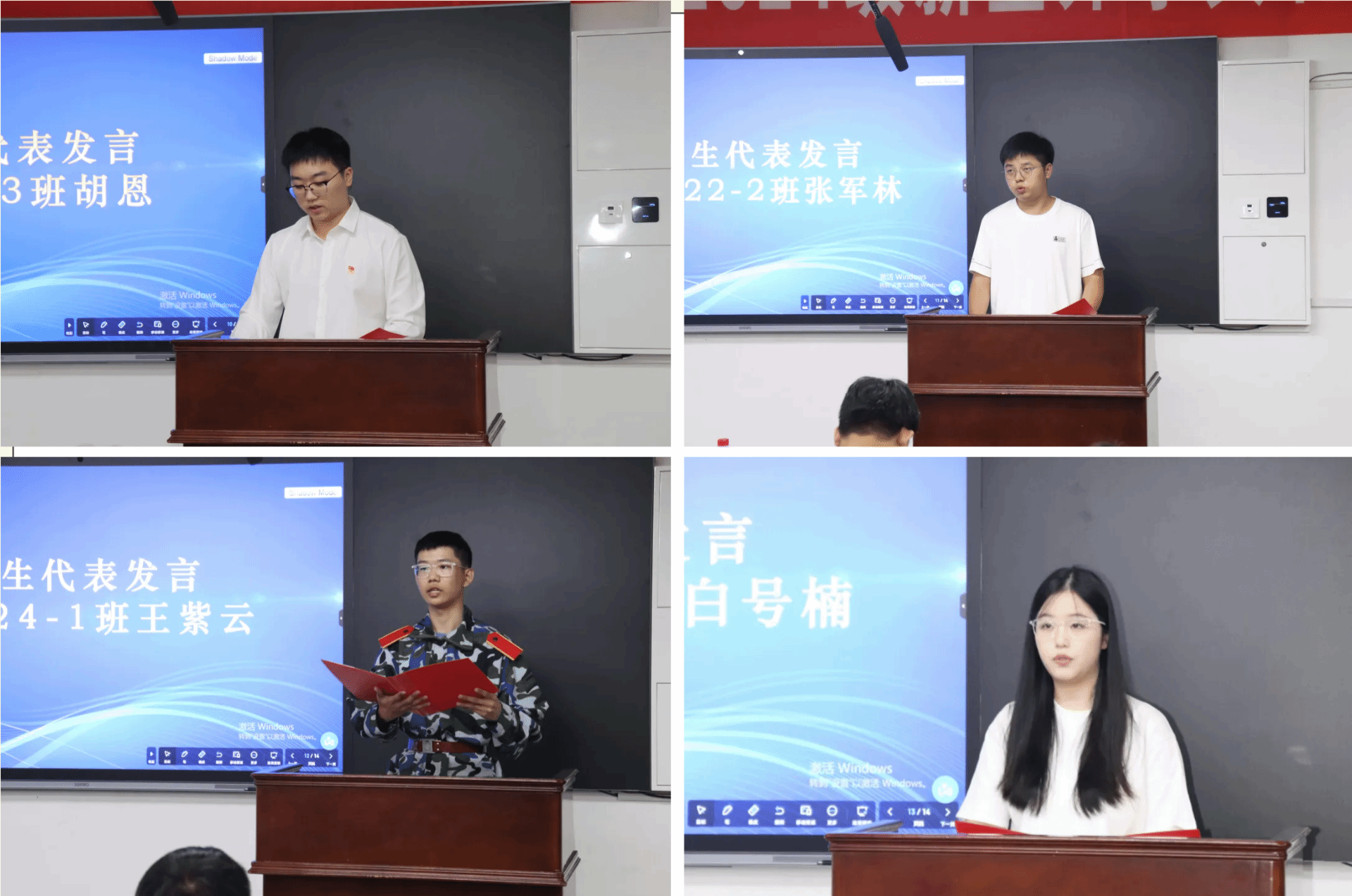 工力21-3班胡恩、研22-2班张军林代表在校生发言,分享自己在大学期间的感悟与学习心得经验,鼓励新生们不断探索自己的兴趣和潜力。工力24-1班王紫云、研24-1班白号楠代表新生发言,表达了对大学生活的憧憬和对学术探索的渴望,努力奋进,不断进取,在新的赛道再创佳绩。