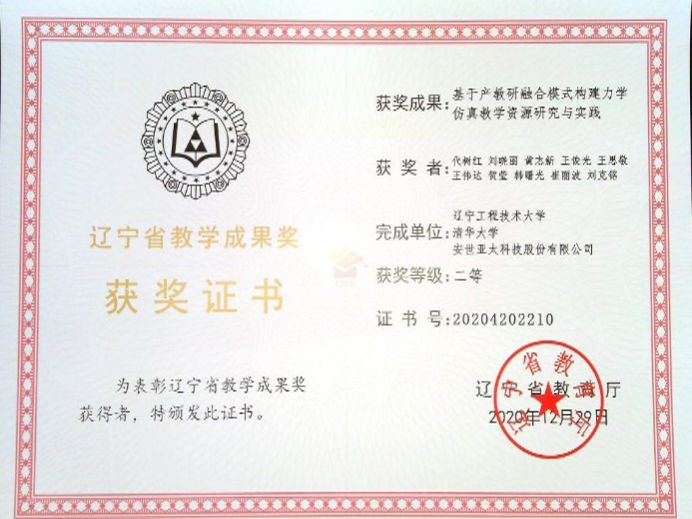 2、辽宁省教学成果二等奖:基于产教研融合模式构建力学仿真教学资源研究与实践,2020年。