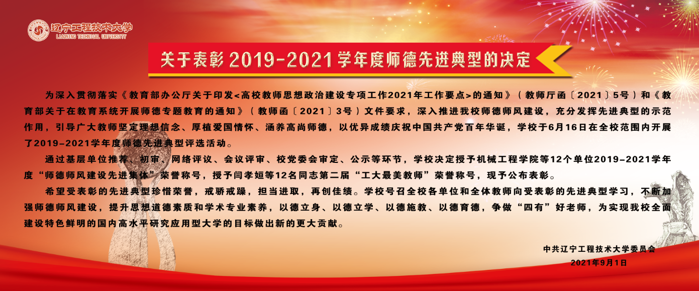 海角视频 工程力学系荣获2019-2021学年度“师德师风建设先进集体”荣誉称号、王俊光荣获第二届“工大最美教师”荣誉称号